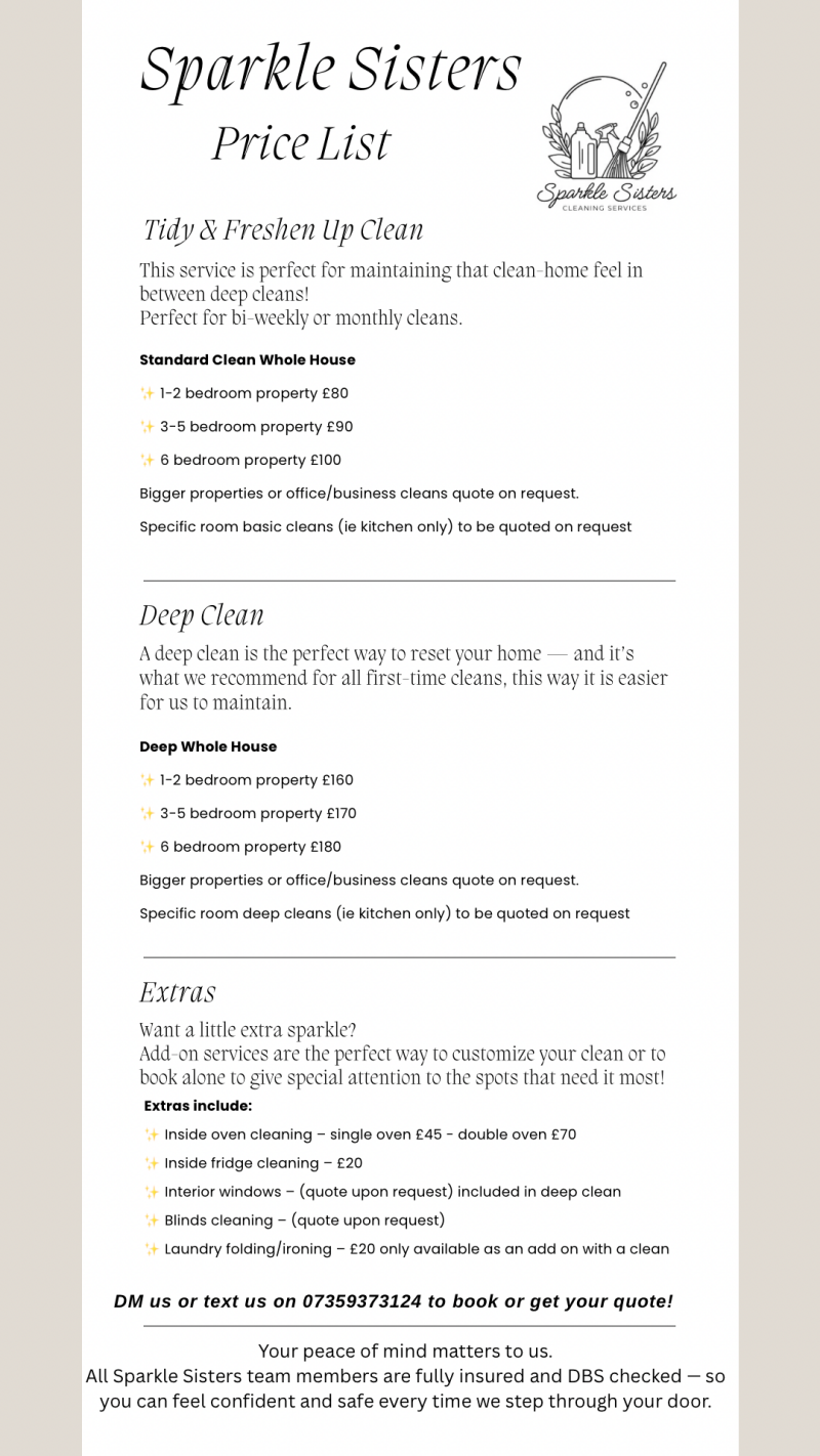 At Sparkle Sisters Cleaning Services, we believe in clear and upfront pricing. We offer a range of cleaning options to suit your needs and budget. Discover our pricing structure and find the perfect cleaning solution for your home or business in Coventry.